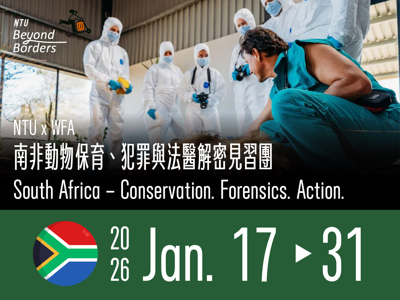 想深入非洲保育前線,揭開非法野生動物交易與鑑識的神秘面紗嗎?邀請你加入「臺大南非動物保育、犯罪與法醫解密見習團」,與Wildlife Forensic Academy 一起投入實地野生動物保育與司法鑑識行動!